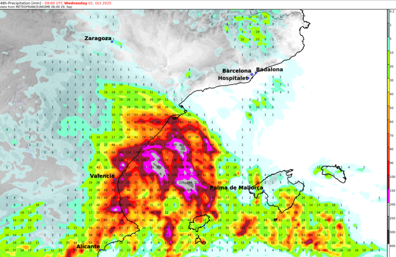 Wenn man derzeit auf die Bodenwetterkarte schaut, meint man, es wäre verbreitet ruhig in Europa, da hoher Luftdruck überwiegt. Doch weit gefehlt, das Wetter wird in der Höhe gemacht. Und dort liegt derzeit ein Höhentief über der Iberischen Halbinsel. Die Wassertemperaturen liegen dort immer noch bei Werten über 25 °C. Somit steht genügend Feuchtigkeit zur Verfügung, um heftigen Regen, teils in Verbindung mit Gewittern zu produzieren.