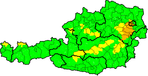 Ähnlich zu gestern wurden heute wieder Sturmböen und Starkniederschläge binnen kurzer Zeit gemeldet. In Kärnten wurde sogar eine Orkanböe gemessen. Die Sturmböen ganz im Osten in folgender Karte wurden kurz nach Mitternacht gemessen und sind noch auf die gestrigen Gewitter zurückzuführen: