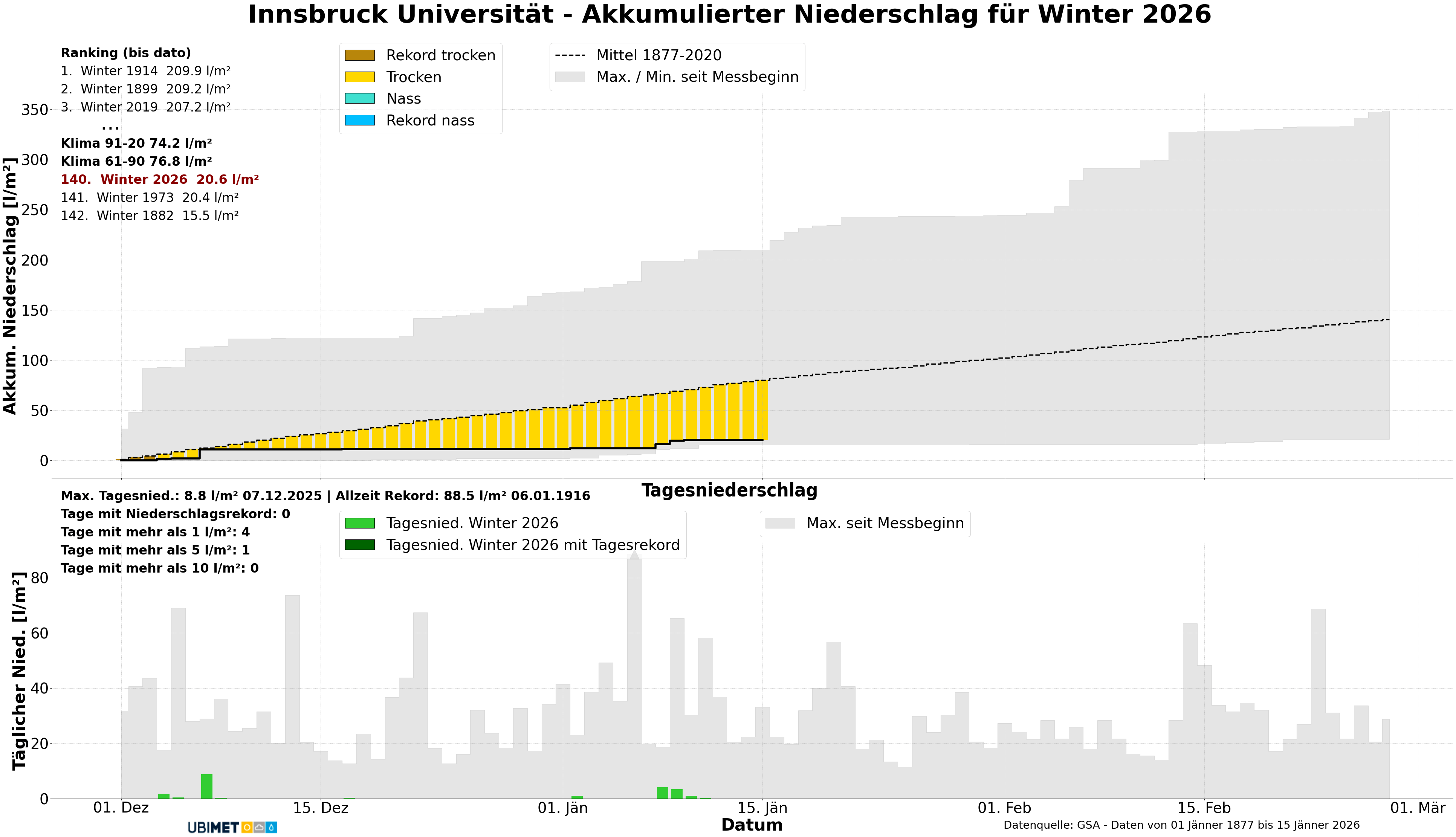 Die Wintermonate 2025/2026 waren zudem bislang außergewöhnlich trocken. Das Manko beträgt landesweit etwa -60 Prozent, in Osttirol und Oberkärnten fehlt jedoch häufig bis zu 80% der zu erwartenden Niederschlägen. In den meisten Regionen auch abseits des Berglands fiel jedenfalls etwa 50 bis 70 Prozent des (wenigen) Niederschlags als Schnee oder gefrierenden Regen. Auch niederschlagsmäßig war zuletzt der Jänner 2017 sehr ähnlich zum heurigen Start ins neue Jahr.